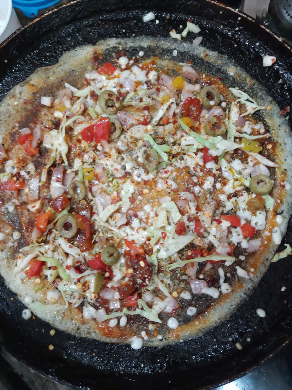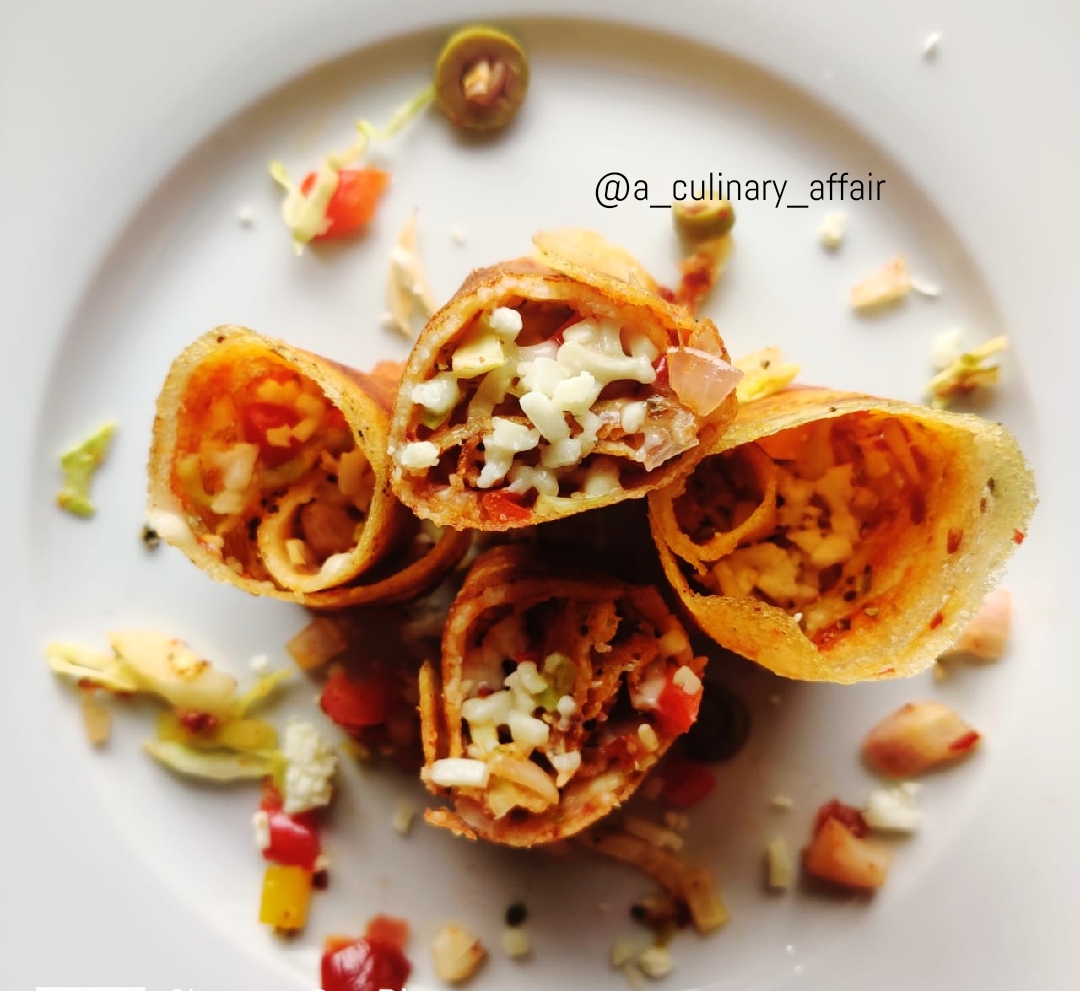 Then comes the fun part,smear the dosa with a spoonful of schezwan sauce and put the vegetables on the dosa, spread it around nicely so it covers the entire dosa. Something like this ! 👇🏼